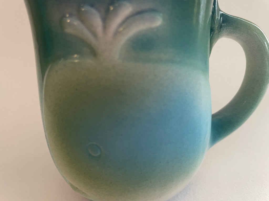 This hand-made colorful mug comes to you from the land of whales on Cape Cod.  Award-winning designer Judith Stiles artfully shapes and glazes each mug. Layers of blue, green, and white paint the picture of a spouting whale to join you for your morning coffee or tea.