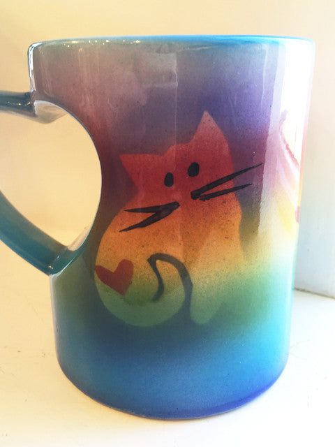 Heart shaped handle for cat lovers! This colorful mug is purrfect for tea and coffee. . .