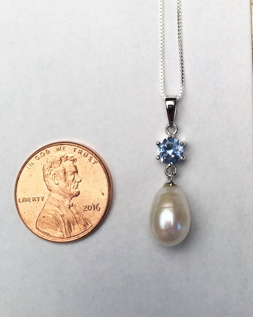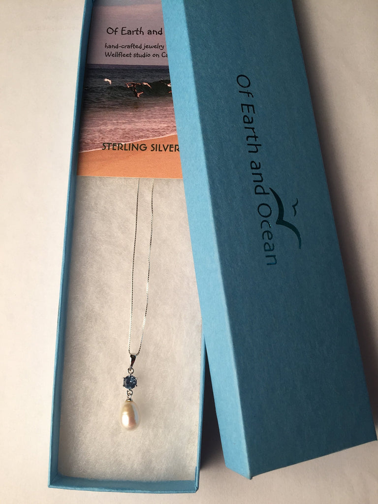 This lovely necklace is handcrafted by the award-winning artist Judith Stiles in her Cape Cod studio. The blue crystal, set in silver, accents the perfect oval freshwater pearl to create a beautiful addition to any outfit. Perfect gift for bridesmaids and wonderful as a Christmas, Hanukkah, or birthday gift. Lightweight in design and comes thoughtfully packaged in an OF EARTH AND OCEAN gift box. 18" sterling silver chain. Pendant measures 1".