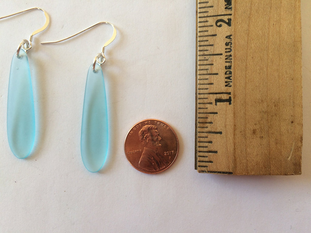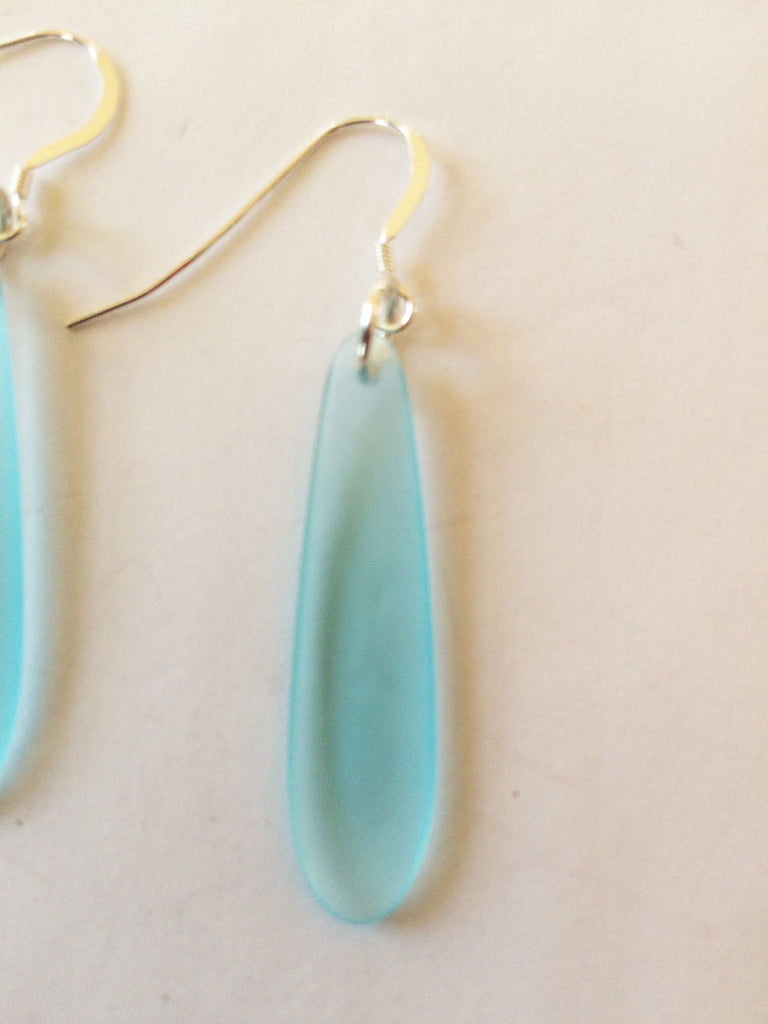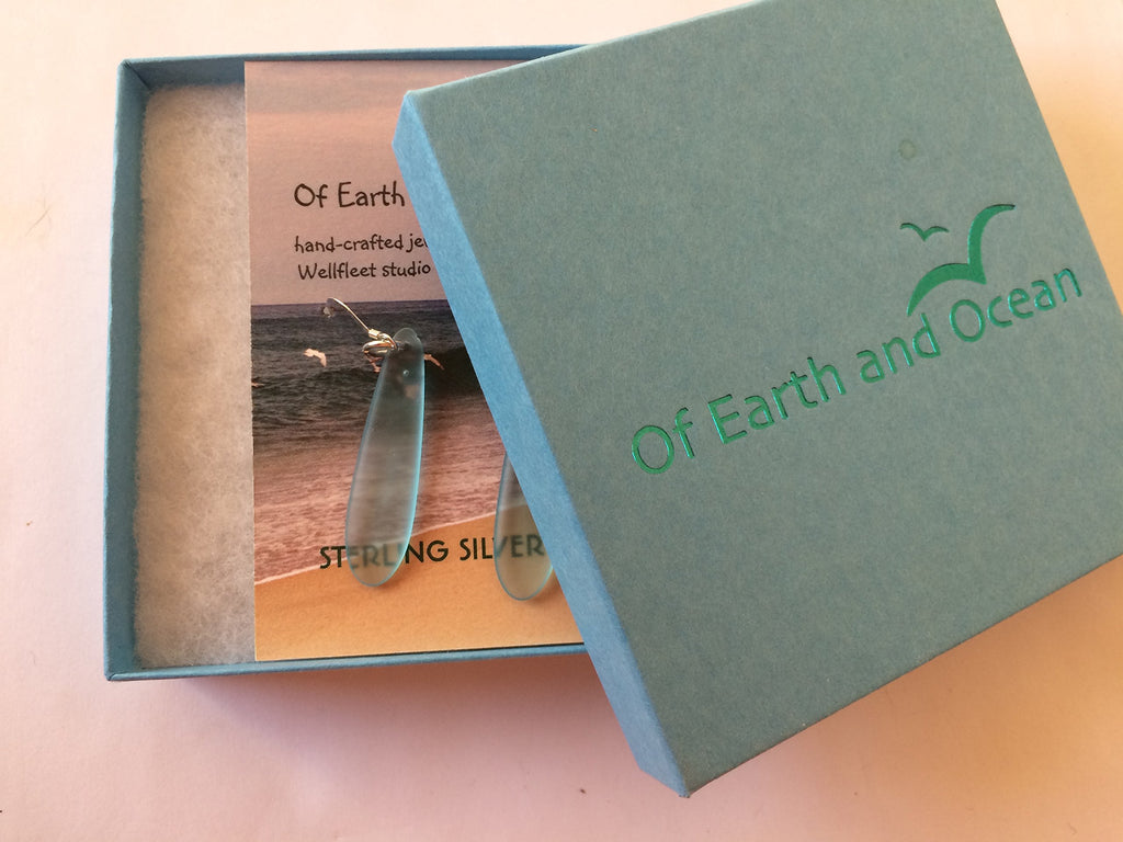 These elegant sea glass earrings are made from recycled glass that is formed and then tumbled in sand to create the lovely matte and translucent finish. .925 sterling silver ear wires. Sea glass measures 1.5". This simple shape is inspired by the power of the ocean and the brilliant colors of the sky on the shores of Cape Cod. Bring the wondrous energy OF EARTH AND OCEAN into your everyday life.