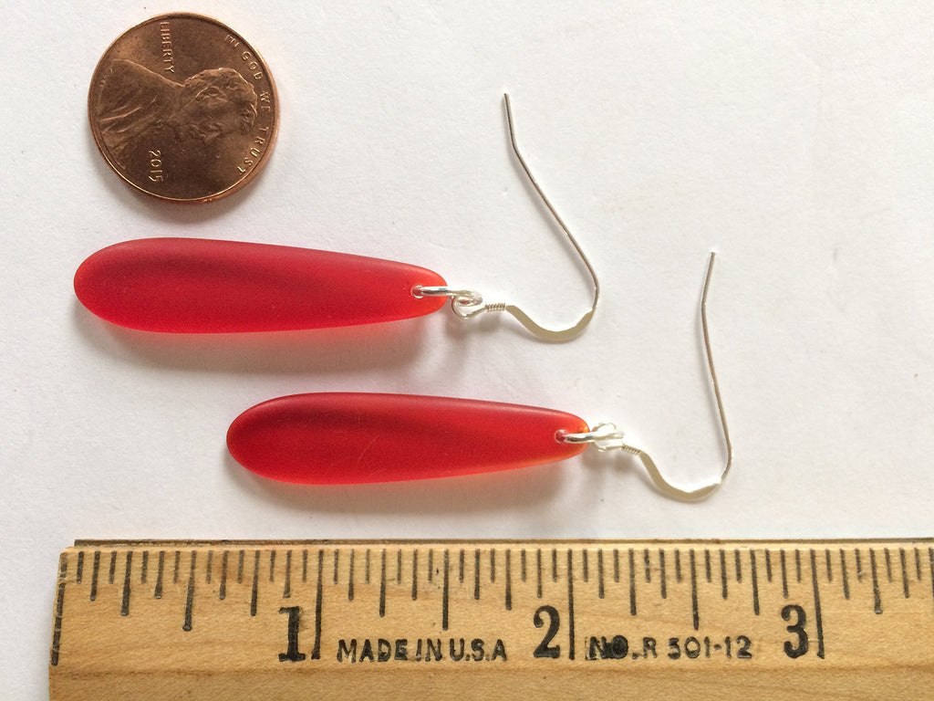 Just in time for Valentine's Day are these handmade tumbled sea glass and sterling silver earrings by award-winning artist, Judith Stiles. OF EARTH AND OCEAN. Perfect holiday gift for that special someone. Looks fantastic with that little black dress. Made from recycled glass that is formed and tumbled in sand to create the lovely satin finish. .925 sterling silver ear wires with 1.4" glass earring.