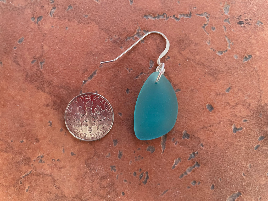 On a bright June morning, the color of the sea is often blue-green like these earrings. Sterling silver ear wires are hypo-allergenic. The sea glass is from recycled glass that is first melted, formed, and then tumbled in sand to create the matt finish.