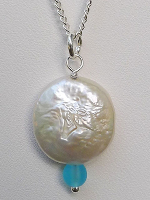 This irridescent Baroque coin pearl is accented with a lovely turquoise sea glass bead.
